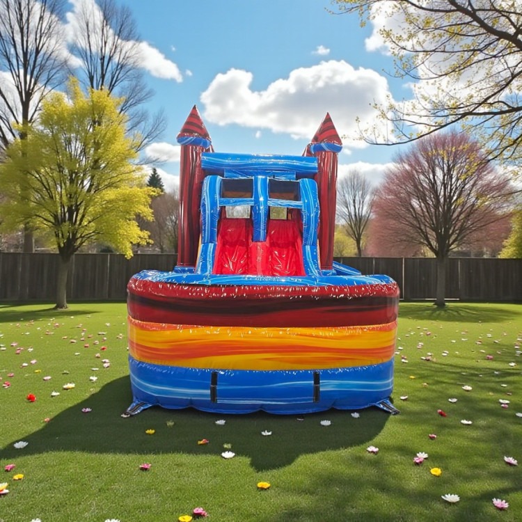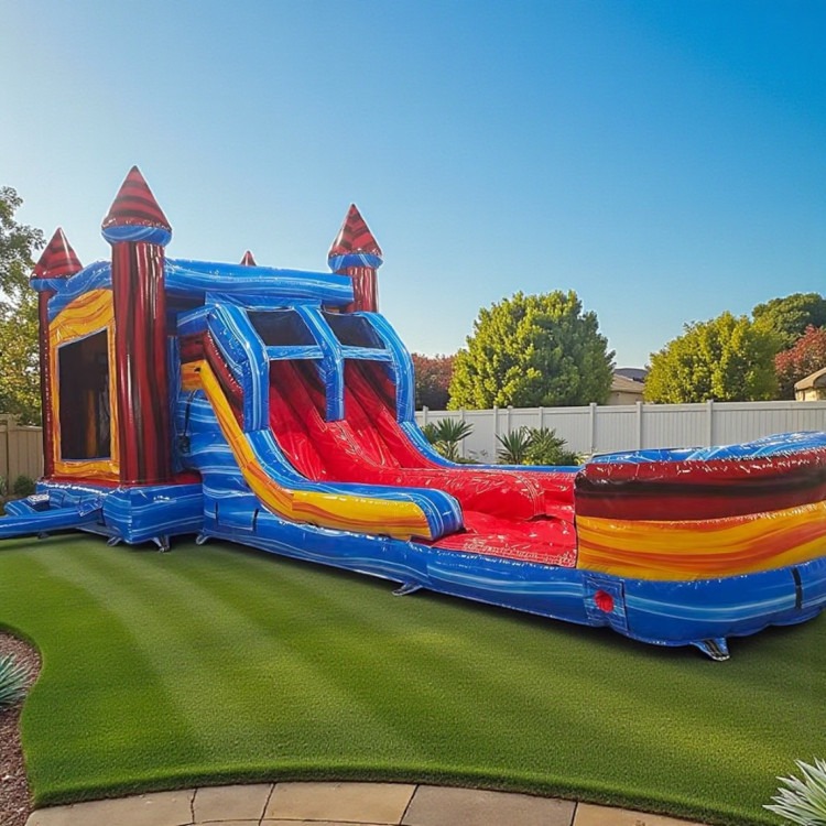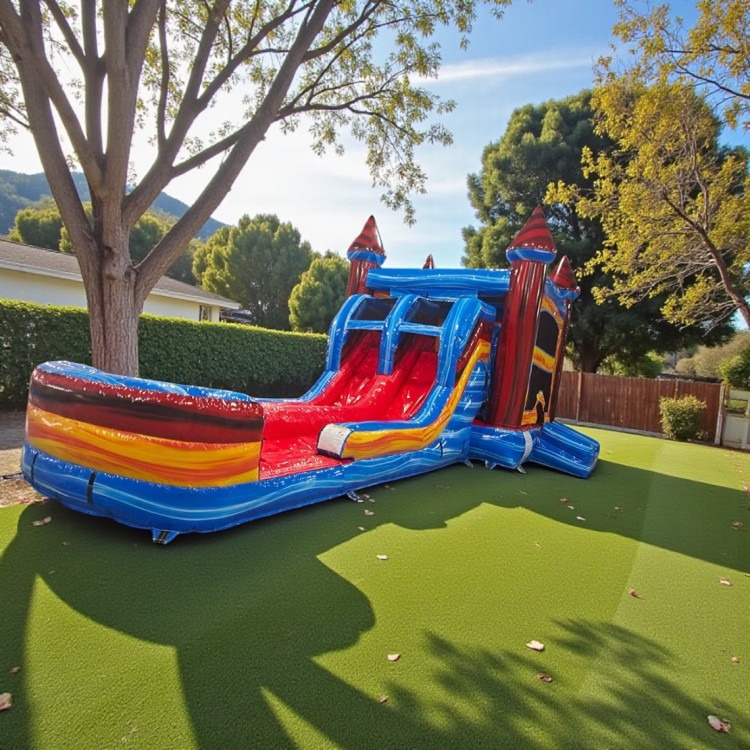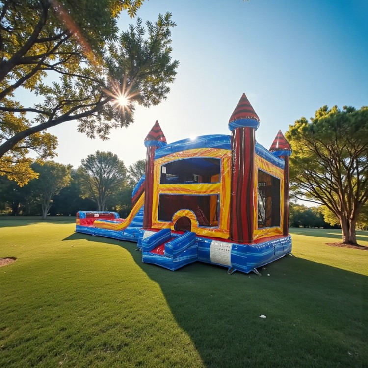Rip Curl Combo — A versatile dual-lane inflatable that’s part bounce house, part waterslide, and all about nonstop fun. This large combo features a spacious bounce pad with two built-in basketball hoops for games and friendly competition, plus a splash pad that can be used wet for sliding and cooling off or dry for all-season play. Designed for groups and active kids, it combines jumping, shooting hoops, and sliding into one rental so parties stay exciting and energetic. Easy to supervise, visually appealing, and perfect for backyard birthdays, block parties, or any event where you want a variety of activities in a single unit.